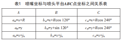 設(shè)噴嘴坐標為)x,y,:),噴頭平臺三點坐標A(ax1,ay1,az1),B(bx1,by1,bz1),C(cx1,cy1,cz1)。根據(jù)三角函數(shù)關(guān)系,易得出噴嘴坐標與噴頭平臺A、B、C點坐標之間的關(guān)系,jh為打印噴頭高度,R為噴頭平臺外接圓半徑,關(guān)系如表1所示。