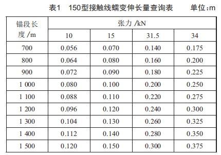 (4)結(jié)合京滬高鐵350km/h區(qū)段運(yùn)行試驗(yàn),總結(jié)出CTMH150型接觸線蠕變伸長量與錨段長度和張力體系存在如下經(jīng)驗(yàn)值(計(jì)量單位為m),如表1所示。