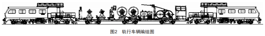 軌行車輛建議配置為1輛恒張力放線車和2輛接觸網(wǎng)作業(yè)車,軌行車輛編組由錨段的起錨端向落錨端編組,采用接觸網(wǎng)作業(yè)車(A)+恒張力放線車+接觸網(wǎng)作業(yè)車(B),軌行車輛編組后,在指定位置解列(一般在起錨位置),作業(yè)車(B)運(yùn)行至下錨側(cè),因此軌行車輛編組如圖2所示。