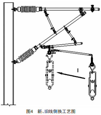 (3)定位、吊弦倒換:下錨后接中錨方向清理線面,先安裝定位,后安裝吊弦。放線滑輪閉口統(tǒng)一朝向支柱側(cè)(防止線索導(dǎo)入方向不一致,新舊導(dǎo)線交叉),倒出的舊廢導(dǎo)線掛在定位管靠近定位環(huán)位置,如圖4所示。倒換定位前,確認(rèn)線面,確認(rèn)換下的舊線在田野側(cè),無誤后即可開始進(jìn)行吊弦和定位的倒換,避免發(fā)生舊線和新線交叉帶來的不利因素。各零部件嚴(yán)格按照標(biāo)準(zhǔn)力矩進(jìn)行緊固,同時(shí)定位偏移量比對腕臂偏移鉛錘設(shè)置。