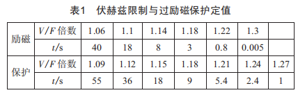 以典型300Mvar雙水內(nèi)冷調(diào)相機(jī)為例,其過勵磁保護(hù)和伏赫茲限制定值如表1所示。