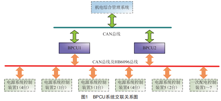 兩臺(tái)匯流條功率控制裝置為主備工作方式,分別為BPCU1和BPCU2,其中BPCU1為主BPCU,位于飛機(jī)左側(cè),BPCU2為備份,位于飛機(jī)右側(cè)。BPCU通過CAN總線與機(jī)電綜合管理系統(tǒng)實(shí)現(xiàn)信息交聯(lián),通過CAN總線及HB6096總線與電源系統(tǒng)控制裝置、一次配電控制裝置實(shí)現(xiàn)信息交聯(lián)。BPCU系統(tǒng)交聯(lián)關(guān)系圖如圖1所示。