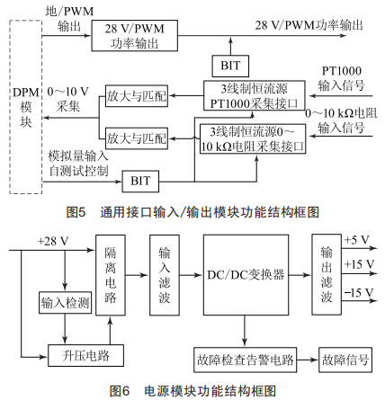 通用接口輸入/輸出模塊功能組成主要包括PT1000模擬量輸入采集電路、0~10kQ電阻輸入采集電路、Pkw輸出驅(qū)動(dòng)電路、BIT支持電路等。通用接口輸入/輸出模塊的功能結(jié)構(gòu)框圖如圖5所示。
