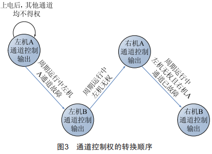 (3)上電后,默認(rèn)由BPCU1的A通道控制輸出,通道控制權(quán)的轉(zhuǎn)換順序如圖3所示,由左機(jī)A通道切換到左機(jī)B通道,由左機(jī)B通道切換到右機(jī)A通道,由右機(jī)A通道切換到右機(jī)B通道:
