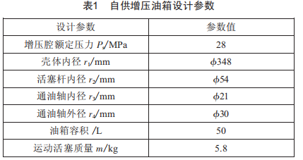選用密閉式自供增壓液壓油箱,液壓泵啟動(dòng)時(shí),油箱內(nèi)的增壓壓力為增壓蓄壓器提供的壓力。液壓泵一開始供壓,其中一部分油液就供入油箱增壓系統(tǒng),壓力油進(jìn)入液壓油箱。油箱中包含有增壓腔及儲(chǔ)油腔,兩腔之間通過結(jié)構(gòu)完全隔離。工作中,利用活塞兩端建立的力平衡過程為儲(chǔ)油腔提供增壓壓力。當(dāng)液壓泵運(yùn)轉(zhuǎn)時(shí),高壓油便經(jīng)過油箱的增壓管流進(jìn)增壓腔,通過增壓壓力的作用,油箱的活塞逐漸向儲(chǔ)油腔內(nèi)移動(dòng),從而完成活塞對(duì)儲(chǔ)油腔的增壓過程。對(duì)油箱增壓情況進(jìn)行靜態(tài)計(jì)算,以確定油箱增壓的設(shè)計(jì)能力。自供增壓型油箱設(shè)計(jì)參數(shù)如表1所示。