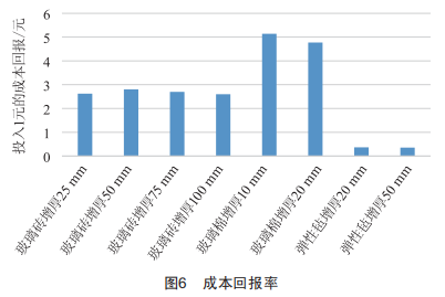 分析圖6數(shù)據(jù)可知每多投入1元成本,不同保冷方案下的成本回報(bào)率。從數(shù)據(jù)可以看出,并不是保冷材料越厚,成本回報(bào)率越高。例如,在罐頂保冷中,玻璃棉增厚10mm比增厚20mm成本回報(bào)率更高:在罐底保冷中,玻璃磚增厚50mm的方案效益最高:在罐壁保冷中,0.32m彈性氈比0.35m彈性氈的成本回報(bào)率更好。