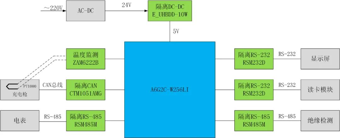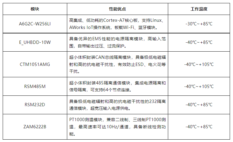 該方案使用了致遠電子的A6G2C系列Cortex-A7核心板、CTM系列CAN隔離、RSM系列RS485、RS232隔離、ZAM系列PT1000測溫,可以完全滿足上述要求。高隔離耐壓性能、高精度溫度采集、小體積模塊與核心板一體化設(shè)計,幫助用戶輕松快速實現(xiàn)功能,同時滿足復雜的電磁環(huán)境、寬泛的工作溫度范圍,有效保障充電環(huán)境的安全與穩(wěn)定。方案使用模塊及性能優(yōu)點如下: