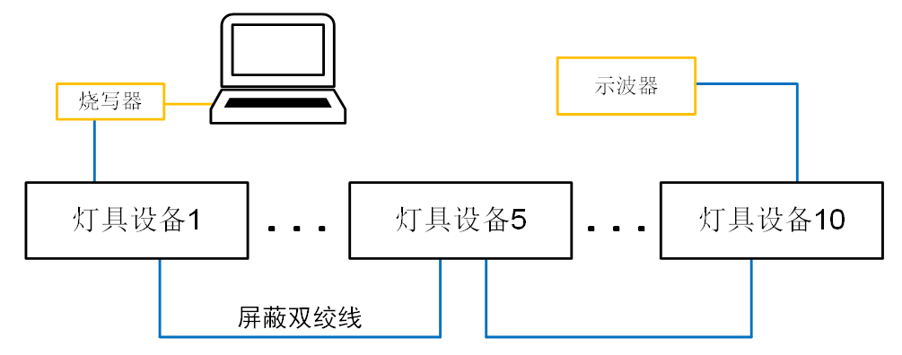 我司某燈光設(shè)備客戶反饋,使用SM4500的燈光具設(shè)備以手拉手方式組網(wǎng)后,在進行程序燒寫時,出現(xiàn)了部分設(shè)備無法燒錄程序的情況,組網(wǎng)簡要框圖如圖9所示。