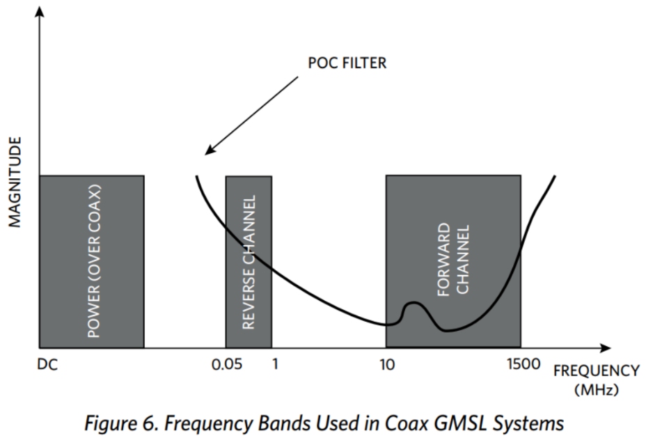 GMSL支持Power Over Coax(同軸供電)功能,要實(shí)現(xiàn)此功能,同軸內(nèi)導(dǎo)體頻譜被分為三個(gè)頻段:供電、反向信道數(shù)據(jù)、前向信道數(shù)據(jù),如下圖所示。通過濾波將確切的頻段分配至對應(yīng)的電路。數(shù)據(jù)通道為AC耦合,通過收發(fā)機(jī)輸入端串聯(lián)電容實(shí)現(xiàn)。
