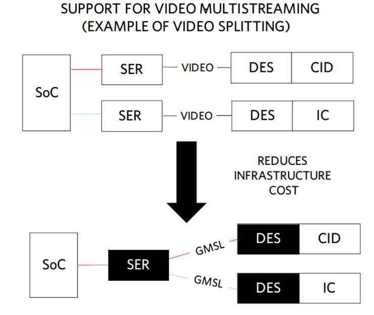 GMSL SERDES芯片自帶SSC功能,以降低鏈路的EMI干擾??紤]到附加的供電與地線要求,GMSL芯片也具備power-over-coaxial架構(gòu)來應(yīng)對降低車重的挑戰(zhàn),具備雙向控制信道。為了降低系統(tǒng)成本減少設(shè)計(jì)時(shí)間,GMSL具備菊花鏈?zhǔn)竭B接多個(gè)攝像頭模組的能力。