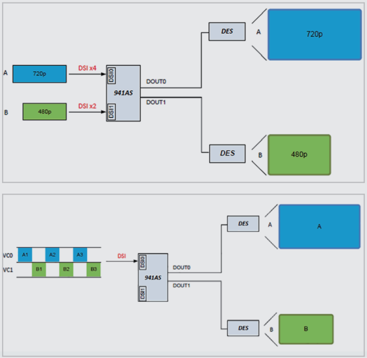 而采用FPD-LINKIII的串行器和解串器,可以靈活的通過一路或多路DSI接口,利用虛擬信道或者同步、異步的分割方式實(shí)現(xiàn)在多個(gè)顯示屏的輸出,如下圖所示: