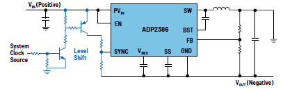 反相降壓-升壓電路產(chǎn)生的負電壓幅度可以高于或低于可用正電壓的幅度。例如,從+12 V可以生成-8 V,甚至-14 V。當(dāng)使用具有反相降壓-升壓電路的開關(guān)穩(wěn)壓器IC時,系統(tǒng)可能需要設(shè)計通信引腳。如果確實需要,設(shè)計人員必須進行充分的電平轉(zhuǎn)換,以便可以利用同步和使能信號。