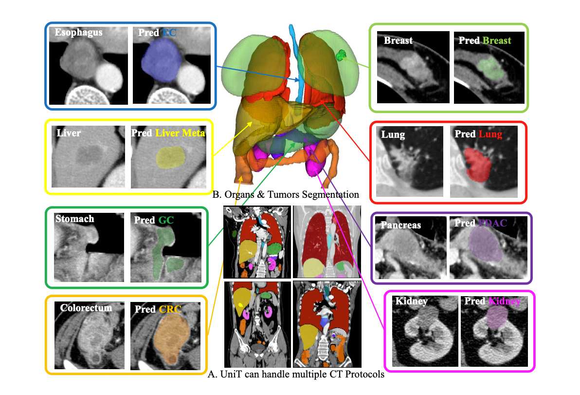 針對上述痛點(diǎn),達(dá)摩院醫(yī)療AI團(tuán)隊聯(lián)合中山大學(xué)腫瘤防治中心、四川省腫瘤醫(yī)院、浙大附屬第一醫(yī)院、盛京醫(yī)院、廣東省人民醫(yī)院等單位,提出了一個統(tǒng)一的多癌影像分析通用模型(cancerUniT),以Mask Transformer語義分割為基礎(chǔ),解決多種腫瘤圖像此前難以統(tǒng)一檢測、分割和診斷的問題,適用于八種主流的高發(fā)高致死癌癥(肺、結(jié)直腸、肝、胃、乳腺、食管、胰腺、腎)以及相關(guān)器官中的腫瘤子類型。