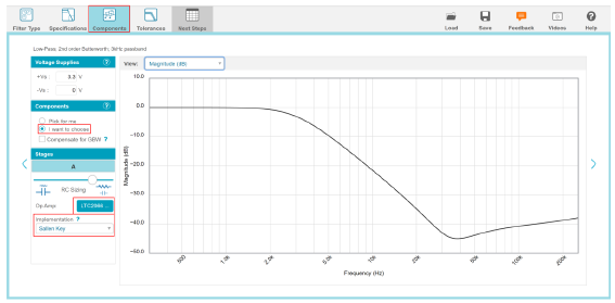 輸入規(guī)格后,左鍵單擊圖8中顯示的“components”(元件)按鈕。在此窗口中,單擊元器件選項(xiàng)卡中的“I want to choose”(我想要選擇)之后,不僅可以選擇電阻和電容的值,還可以選擇運(yùn)算放大器基準(zhǔn)電壓源。您還可以選擇將濾波器實(shí)現(xiàn)為Sallen-Key型還是多反饋型。為了盡可能接近設(shè)計(jì)步驟,這里選擇LTC2066。該工具還會提供電阻和電容的標(biāo)準(zhǔn)值,同樣,我們將選擇盡可能接近以上計(jì)算值的元件。