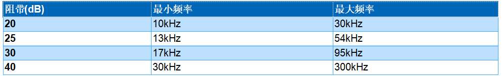 使用此工具的第一步是參考目標(biāo)低通濾波器設(shè)計(jì)的規(guī)格。為了實(shí)現(xiàn)僅有一級的二階濾波器,阻帶規(guī)格需要滿足某些要求。根據(jù)阻帶的分貝(dB)值的不同,二階濾波器的頻率間隔是不同的。當(dāng)為不同的阻帶dB值選擇3kHz的截止頻率時,設(shè)置二階濾波器的頻率間隔如表2所示。