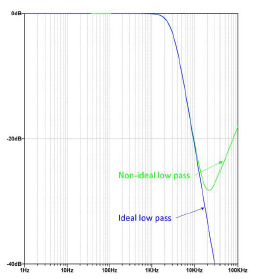 不僅應(yīng)該監(jiān)視Sallen-Key濾波器的高頻特性,而且必須知道它在什么頻率開始再次提高,如圖6中的綠色曲線所示部分,而藍(lán)色曲線是理想特性。此限制被稱為阻帶限制。