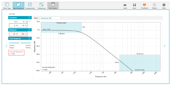 根據(jù)設(shè)計(jì)步驟,通帶的特征是0dB增益和3kHz (-3dB)截止頻率。在25kHz時,阻帶規(guī)格將是-30dB。最后,您可以選擇濾波器響應(yīng),也就是您想要使用哪種濾波器(巴特沃茲、切比雪夫、貝塞爾……)。正如設(shè)計(jì)注意事項(xiàng)第2點(diǎn)所述,為了盡可能接近上述理論,我們將選擇二階巴特沃茲濾波器。在第一個窗口中,可以看到剛剛輸入的規(guī)格中的級數(shù),如圖7所示。