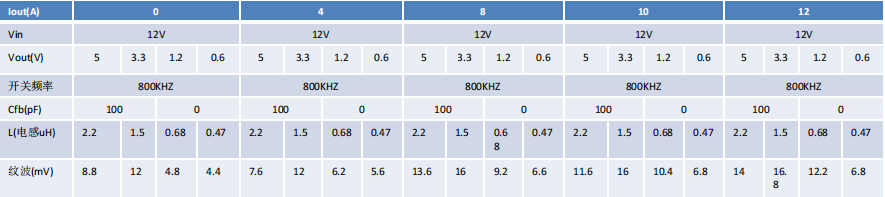 FPWM模式(靜態(tài)負(fù)載)紋波測(cè)試數(shù)據(jù)