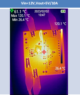 溫升測(cè)試如下圖,TMI32120滿載時(shí)熱測(cè)試數(shù)據(jù)(OTP=160°C),Vin=12V, Vout=5V/10A,輸出功率高達(dá)50W條件下,在3.5mmx3.5mm小封裝條件下的芯片表面溫升僅有94℃,發(fā)熱小,效率高,能有效降低和控制系統(tǒng)整體的溫度。