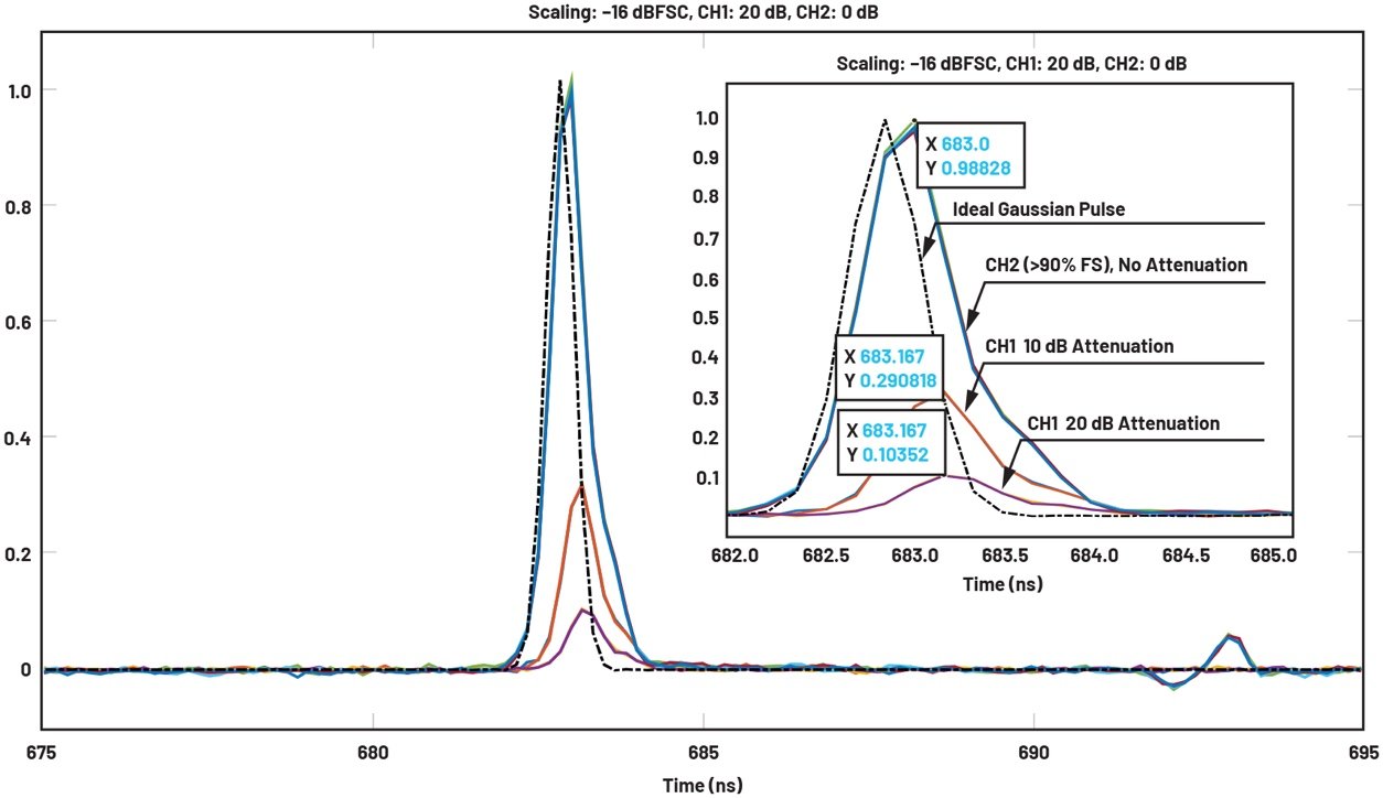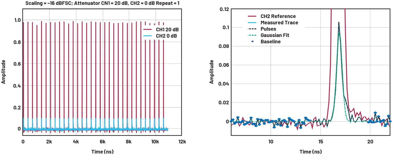 MxFE可智能集成RF ADC、數(shù)模轉(zhuǎn)換器(DAC)、片內(nèi)數(shù)字信號處理和時鐘/鎖相環(huán)(PLL),支持多芯片同步。市場上也有僅配備高速ADC的MxFE器件。為了簡化起見,我們的基準(zhǔn)測試使用了AD9082,其集成了ADC和DAC,如圖3所示。集成DAC用于生成FWHM為0.5 ns的窄高斯脈沖串,其幅度由數(shù)字縮放和外部衰減器組合來控制。高斯脈沖比用于ADC表征的典型單音信號更接近質(zhì)譜中的信號。設(shè)置兩個ADC通道對信號進(jìn)行數(shù)字化處理:CH1針對通過改變外部衰減器使之飽和或衰減的各種幅度;CH2作為參考,用于高于90%滿量程(FS)且未飽和的信號強度。在我們的測試中,采樣速率為6 GSPS,以便為每個脈沖提供足夠的樣本。
