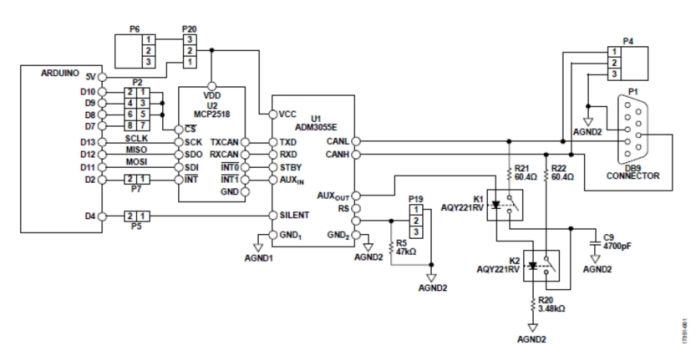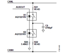 120Ω端接電阻可通過單個(gè)電阻實(shí)現(xiàn)。不過,將單個(gè)電阻分成兩個(gè)串聯(lián)的60 Ω電阻可為暴露在CAN總線上的兩個(gè)繼電器引腳提供低成本的靜電放電(ESD)保護(hù)。利用第二個(gè)SSR實(shí)現(xiàn)可切換端接電路,還可增加一個(gè)濾波電容。增加的這個(gè)電容與分路端接電阻一起提供低通濾波器,以減少CAN總線上的共模噪聲。