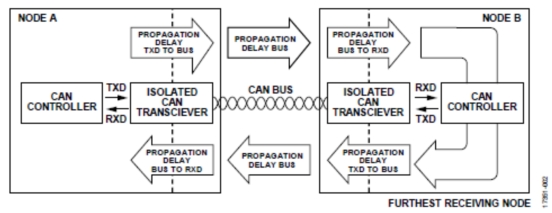 如圖2所示,信號(hào)路徑從節(jié)點(diǎn)A CAN控制器開始傳輸時(shí)開始。信號(hào)首先通過節(jié)點(diǎn)A發(fā)送器,然后在電纜上傳輸,再通過最遠(yuǎn)節(jié)點(diǎn)的接收器,最后到達(dá)最遠(yuǎn)的CAN控制器。在仲裁階段,接收節(jié)點(diǎn)可能也在發(fā)送信號(hào),因此還必須考慮從節(jié)點(diǎn)B到節(jié)點(diǎn)A的信號(hào)傳輸延遲。這種傳輸延遲的最壞情況決定仲裁階段的絕對(duì)最大數(shù)據(jù)傳輸速率。