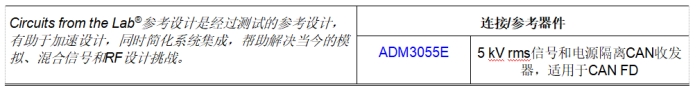 惡劣的環(huán)境、長(zhǎng)時(shí)間的物理分隔,以及節(jié)點(diǎn)之間不同的電源都會(huì)導(dǎo)致局部接地電位不同,并且是經(jīng)常如此。不同的局部接地電位會(huì)導(dǎo)致電流流經(jīng)地線,從而引起共模偏移和噪聲。隔離物理總線線路可斷開接地環(huán)路,并消除這些問題。ADM3055E可斷開接地環(huán)路,并已通過CAN FD節(jié)點(diǎn)和CAN總線線路之間5 kV rms信號(hào)和電源隔離的系統(tǒng)級(jí)安全認(rèn)證。