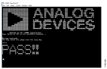 當(dāng)連接到PC時(shí),可以命令每個(gè)CAN節(jié)點(diǎn)執(zhí)行通信環(huán)回測(cè)試。CAN控制器將置于外部環(huán)回模式,其中發(fā)送線路在內(nèi)部連接到接收線路。CAN發(fā)送自定義消息,并檢查是否收到相同的消息。如果接收到環(huán)回消息,則在CLI上以ASCII字符形式顯示消息,ADICUP3029上的LED會(huì)閃爍。圖7所示為串行終端接收到的消息截圖。