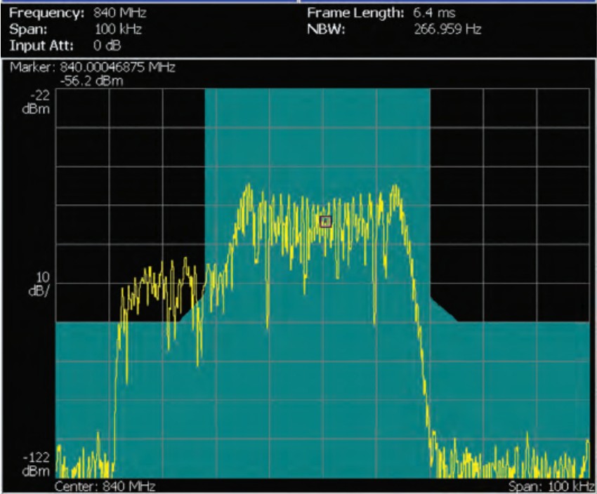 ● 頻率模板觸發(fā):RSA將頻譜形狀與用戶定義的模板進行比較,在指定的頻譜形狀變化時觸發(fā)儀器(圖5)。RSA可以在頻率上升或下降時觸發(fā),類似于時域電平觸發(fā)的工作方式。借助這種強大的技術(shù),即使存在電平較高的其他信號,Tek RSA也能可靠地檢測到遠(yuǎn)低于儀器滿量程的信號。這種在存在強信號的情況下觸發(fā)弱信號的能力,對于檢測間歇信號、互調(diào)產(chǎn)物的存在、瞬態(tài)頻譜遏制違規(guī)以及其他頻率效應(yīng)至關(guān)重要。