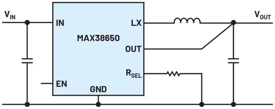 如圖3所示,電路僅需要少量無源外部元件。僅使用RSEL引腳上的一個電阻來設置輸出電壓,并未使用電阻分壓器。電阻分壓器會消耗相當多的電流,根據(jù)電壓和電阻的不同,此電流可能大大超過MAX38650的靜態(tài)電流。因此,該IC使用可變電阻,僅在電路接通時短暫檢查此電阻。該IC通過以下方式檢測設定點輸出電壓值:在接通期間的短時間內(nèi),使200 μA的電流流過該可變電阻。然后測量所產(chǎn)生的電壓,并將其存儲在IC內(nèi)部。這意味著,在通過常規(guī)分壓器運行期間不會有能量損失。