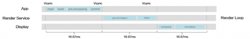 在HarmonyOS NEXT中,圖形系統(tǒng)采用了統(tǒng)一渲染的模式,遵循著一個典型的流水線模式,以60Hz刷新率為例,整個過程如下圖二所示,如果是90Hz,每個Vsync的周期就是11.1ms了。