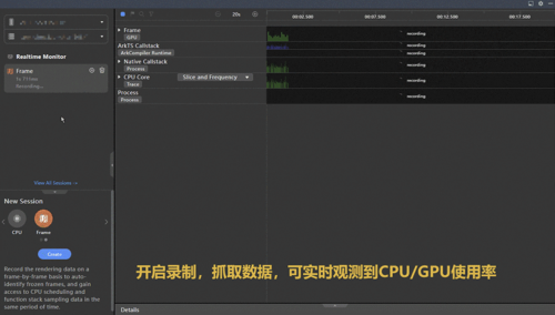 首先是模板的選擇和錄制,這一步驟是很簡單的。開發(fā)者們只需要點幾下鼠標,然后在錄制期間復現(xiàn)卡頓丟幀場景即可。整個過程如圖五所示,在錄制期間,DevEco Profiler會使用HarmonyOS NEXT中豐富的DFX工具,自動地為開發(fā)者們采集丟幀場景下所需的各類性能數(shù)據(jù),錄制解析完成之后,就可以展開分析了。