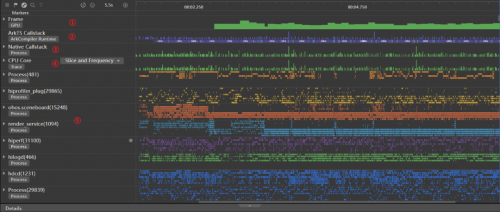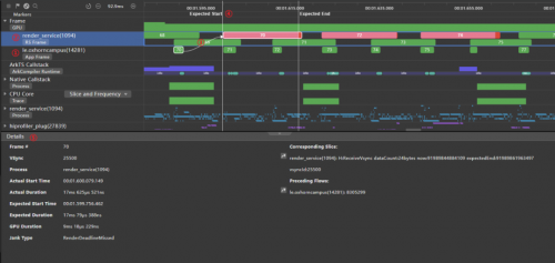 ⑤ 詳細數(shù)據(jù):為您提供被選擇的幀的詳細數(shù)據(jù),通過Corresponding Slice或Preceding Flows的跳轉(zhuǎn)按鈕,您可以快速找到對應(yīng)的詳細system trace做進一步分析通過這一條泳道,開發(fā)者們可以快速發(fā)現(xiàn)丟幀的位置,并完成初步的定界:如果是應(yīng)用幀處理有紅色出現(xiàn),那需要進一步審視在UI線程中的處理邏輯,是否過于復雜或低效,又或者是被別的什么任務(wù)搶占了資源;如果是RenderService幀處理有紅色出現(xiàn),那需要審視是否是界面布局過于復雜。后者可以借助DevEco Studio內(nèi)的ArkUI Inspector等工具進一步分析,本文不做過多闡述。針對前一種現(xiàn)象我們繼續(xù)分析。