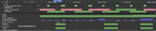 ⑤ System Trace泳道:抓取和呈現(xiàn)各個進程的system trace和user trace,幫助開發(fā)者了解查看系統(tǒng)的運行細節(jié),和某些核心任務(wù)的準確運行時間。在分析丟幀問題時,首先可以聚焦展開第一條Frame泳道。在這條泳道中,我們抓取了圖形渲染過程的一些關(guān)鍵節(jié)點信息,并將其可視化了出來,如圖七所示。
