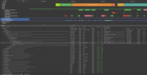將ArkTS Callstack泳道中紅色幀的時段框選起來之后,就可以在下方詳情面板中查看到這段時間的函數(shù)熱點了。我們提供了兩種函數(shù)熱點展現(xiàn)形式供開發(fā)者選擇,一種是Top-Down形式的一個樹狀列表,如圖九所示;另一種則是許多開發(fā)者可能更耳熟能詳?shù)幕鹧鎴D,如圖十所示。開發(fā)者們可以選擇自己習慣的方式去查看。一般來說,如果所選的時間段里,函數(shù)棧比較復雜的話,用火焰圖找熱點會更高效。在這兩種形式之外,我們還提供了一個自動查找瓶頸路徑的能力,也就是顯示在圖九和十右側(cè)的部分。當您在左側(cè)Top-Down或火焰圖中點擊某個具體的函數(shù)棧幀結(jié)點后,我們會為您計算找到從這個節(jié)點往下,最耗時的那條調(diào)用路徑,當您點擊這條調(diào)用路徑上的函數(shù)棧幀時,左側(cè)的圖表也會自動展開或聚焦到對應(yīng)結(jié)點上,為您提升瓶頸定位效率。