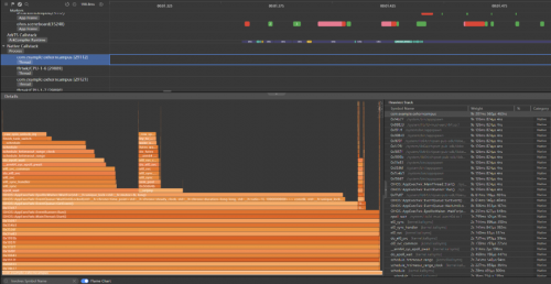 在找到了處理超時的幀之后,開發(fā)者們可以有兩種選擇,一種是分析system trace,另一種則是分析采樣得到的函數(shù)熱點。前一種方式需要對整個系統(tǒng)和關(guān)鍵的trace點有深入的了解,對于現(xiàn)階段的開發(fā)者們可能還有些困難,所以我們還是建議開發(fā)者們直接分析函數(shù)熱點。分析的方式很簡單,找到ArkTS Callstack泳道,框選一下即可。這里有一個小技巧,開發(fā)者們可以點擊泳道信息區(qū)的收藏按鈕,將應(yīng)用幀處理的泳道收藏置頂,如圖八所示,可以有效防止上下文信息丟失。