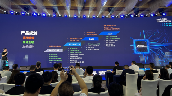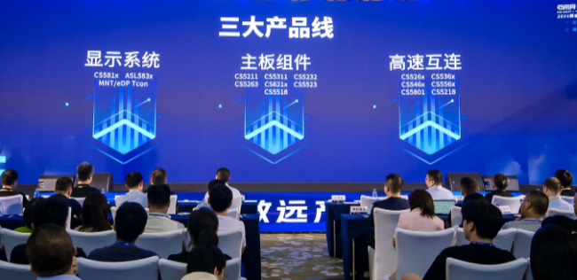 致辭過后,在一眾期待之中,迎來了集睿致遠(yuǎn)的產(chǎn)品發(fā)布會(huì),重點(diǎn)展示了顯示系統(tǒng)、主板組件、高速互連三大產(chǎn)品線。其中,顯示系統(tǒng)系列包CS581x、ASL583x等產(chǎn)品;主板組件系列包括CS5211、CS5311、CS5232、CS5263、CS621x、CS5523、CS5518等產(chǎn)品;高速互聯(lián)系列包括CS526x、CS536x、CS546x、CS556x、CS5801、CS5218等產(chǎn)品。