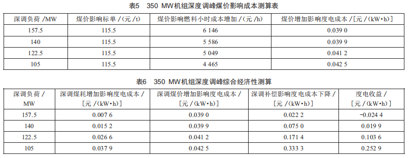 根據(jù)公式(3)(4)得出350MW機(jī)組深度調(diào)峰煤價(jià)影響成本測算表,如表5所示。