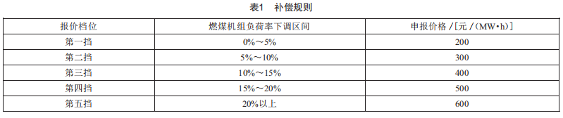 當(dāng)前市場啟動(dòng)條件包括三種情況:一是在日前或日內(nèi)進(jìn)行負(fù)荷預(yù)測和計(jì)算負(fù)荷備用,當(dāng)預(yù)計(jì)某電網(wǎng)負(fù)荷備用小于裕度值,需要將一臺及以上并網(wǎng)機(jī)組降至有償調(diào)峰基準(zhǔn)值以下時(shí):二是有網(wǎng)內(nèi)棄水電廠需要購買輔助服務(wù)時(shí):三是網(wǎng)外清潔能源消納困難,需要購買某調(diào)峰輔助服務(wù)時(shí),開展深度調(diào)峰交易。機(jī)組在有償調(diào)峰基準(zhǔn)的基礎(chǔ)上,采用下調(diào)容量比率形式分擋報(bào)價(jià)。燃煤機(jī)組以5%容量作為一個(gè)報(bào)價(jià)檔位,由第一擋至第五擋按照價(jià)格遞增的原則逐段申報(bào),最大下調(diào)功率自行確定市場初期對每擋申報(bào)價(jià)格設(shè)置價(jià)格上限。其中補(bǔ)償規(guī)則如表1所示。