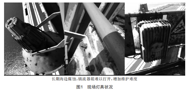 現(xiàn)場(chǎng)燈具狀況如圖1所示,照明燈具防護(hù)罩、底座、支架銹蝕嚴(yán)重,透明件密封圈老化嚴(yán)重,導(dǎo)致內(nèi)部積污較多,縮短了燈具使用壽命。