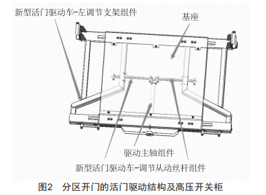 分區(qū)開(kāi)門(mén)的活門(mén)驅(qū)動(dòng)結(jié)構(gòu)及高壓開(kāi)關(guān)柜整體如圖2所示,該裝置為一種分區(qū)開(kāi)門(mén)的活門(mén)驅(qū)動(dòng)結(jié)構(gòu),主要包括基座、調(diào)節(jié)支架、調(diào)節(jié)從動(dòng)絲桿、驅(qū)動(dòng)軸。