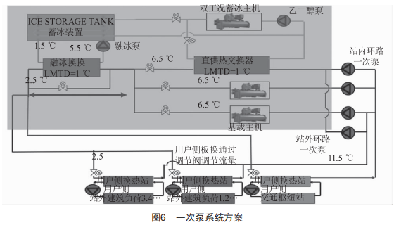 常規(guī)集中供冷項(xiàng)目考慮到冷凍水管網(wǎng)的輸送阻力,一般采用二次泵系統(tǒng),如圖5所示。廣州某集中供冷冷站的集中供冷室外管網(wǎng)摒棄了二次泵系統(tǒng)的設(shè)計(jì),在按最不利用戶管路阻力水力平衡計(jì)算的前提下,采用一次泵系統(tǒng)的設(shè)計(jì),如圖6所示。