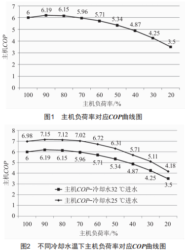 (2)在實(shí)際運(yùn)行時(shí)保持機(jī)組在"高效區(qū)間"范圍內(nèi)運(yùn)行,盡量避免在非高效區(qū)間內(nèi)運(yùn)行。如圖1、圖2所示,當(dāng)主機(jī)負(fù)荷率低于80%時(shí),c0P值有下降的趨勢(shì)。因此,在制冷主機(jī)容量選型配置時(shí),應(yīng)該充分考慮負(fù)荷的變化,保證主機(jī)盡可能在高效區(qū)間運(yùn)行。