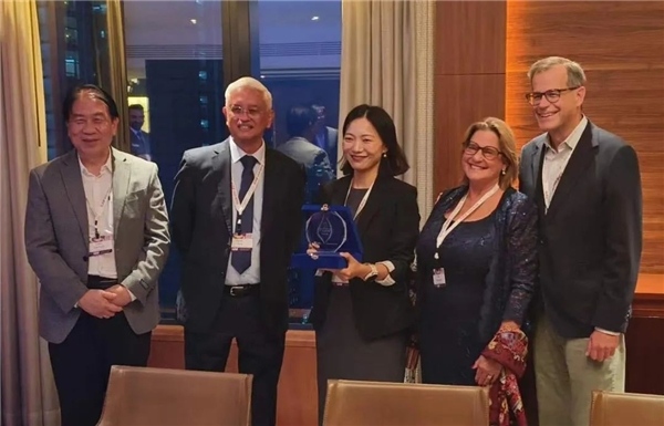 Eve Wang(中)代表思摩爾為VAPORESSO COSS領(lǐng)取金葉獎(jiǎng)“創(chuàng)新獎(jiǎng)”