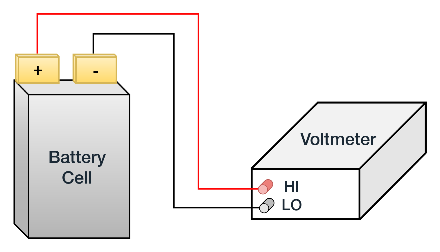 圖1. 對(duì)電芯執(zhí)行開路電壓測(cè)量需要將萬用表連接到電池的正負(fù)極端子