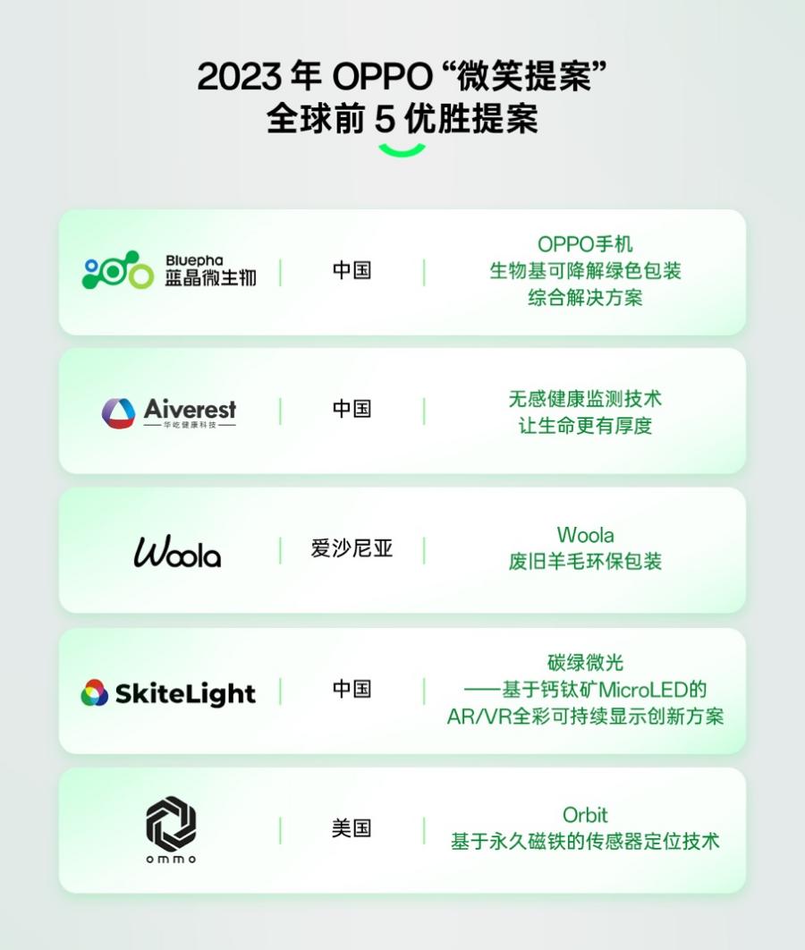最終,OPPO 研發(fā)及投資業(yè)務(wù)相關(guān)負(fù)責(zé)人、及來(lái)自權(quán)威投資機(jī)構(gòu)淡馬錫國(guó)際、全球移動(dòng)通信系統(tǒng)協(xié)會(huì)(GSMA)、富達(dá)國(guó)際等外部專(zhuān)家圍繞“應(yīng)用性落地”、“科技創(chuàng)新性”、“社會(huì)公共價(jià)值”和“長(zhǎng)期發(fā)展?jié)摿Α彼拇缶S度,現(xiàn)場(chǎng)從全球前 15 提案中評(píng)選出 5 支優(yōu)勝提案,每個(gè)提案團(tuán)隊(duì)將獲得 5 萬(wàn)美元獎(jiǎng)金以及更多未來(lái)合作機(jī)會(huì)。其中,來(lái)自中國(guó)賽區(qū)的《無(wú)感健康監(jiān)測(cè)技術(shù)-讓生命更有厚度》、《OPPO手機(jī)生物基可降解綠色包裝綜合解決方案》、《碳綠微光——基于鈣鈦礦MicroLED的AR/VR全彩可持續(xù)顯示創(chuàng)新方案》項(xiàng)目成功入選全球TOP5優(yōu)勝提案。