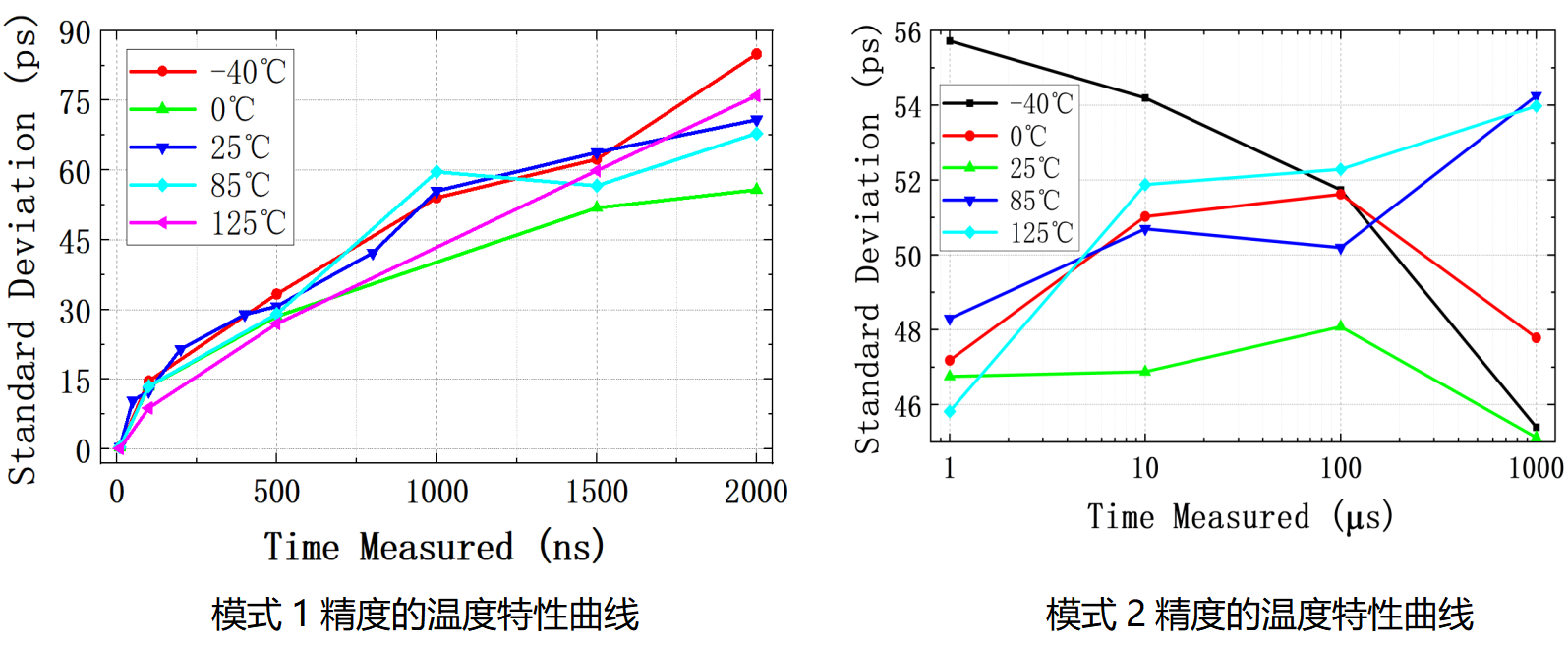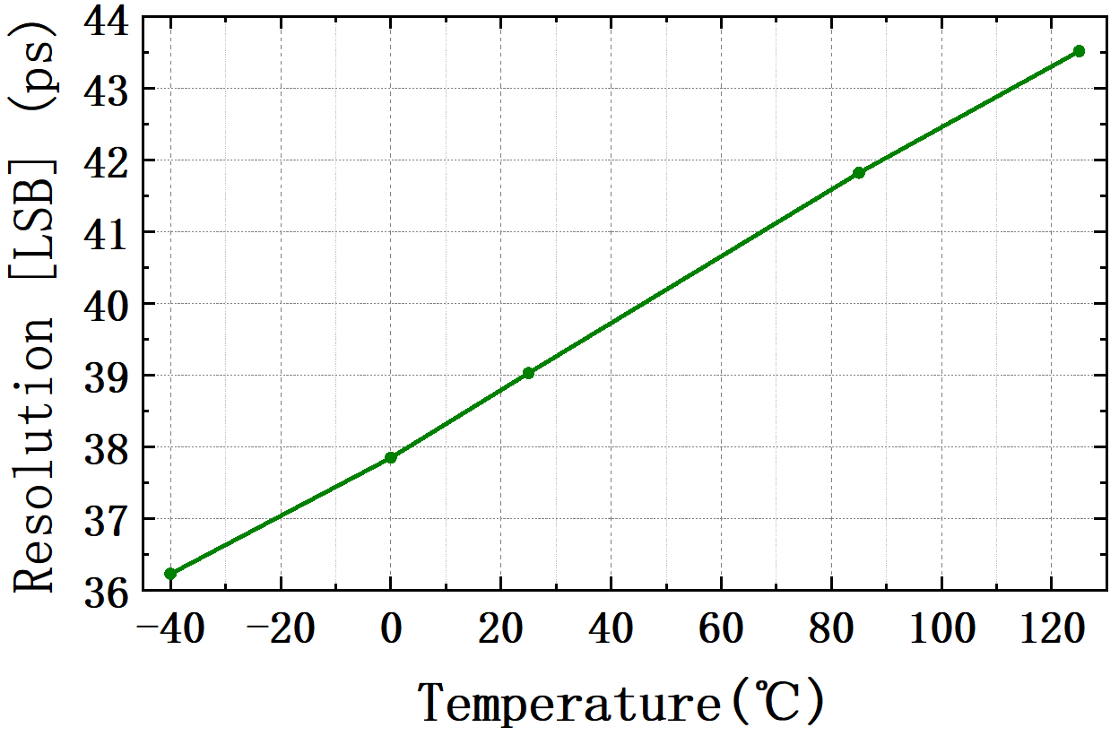 測距設備應用環(huán)境較為復雜,需要在各種環(huán)境溫度下工作,要求TDC擁有較高的環(huán)境魯棒性。如下圖所示,TMIS7701/7702在?40℃~125℃范圍內,500ns的飛行時間,測量結果值從最低溫到最高溫僅偏移了0.6ns,在同類產品中處于較低水平,而且良好的溫漂一致性可以很方便地進行溫度補償。通過采用指定的溫漂系數(shù)進行補償,TMIS7701/7702產品在?40℃~125℃范圍內的測量誤差不超過±60ps (3sigma,99.74%置信概率)。