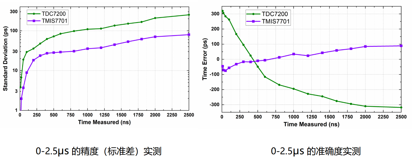 通過創(chuàng)新性的電源噪聲抑制等自主知識產權技術,TMIS7701/7702實現(xiàn)了極低的隨機抖動,從而能夠實現(xiàn)更高的測量精度。下圖為TMIS7701工作在模式1下的標準差(精度)分布情況,在100ns內標準差≤10ps,顯著優(yōu)于同類產品(TI的TDC7200)。在0~2.5μs的飛行時間內,采集的原始數(shù)據(jù)的標準差小于80ps,有利于整機產品實現(xiàn)具有高重復精度的測距效果。
