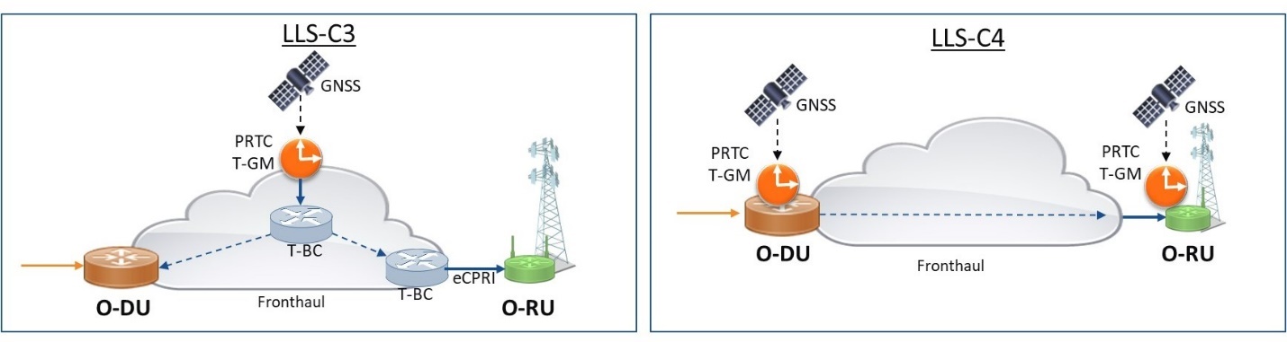 配置LLS-C4是四種拓撲中最優(yōu)先采用且最容易實現(xiàn)的,但可能也是成本最高的一種。在此配置中,RU會從用作每秒脈沖數(shù)(PPS)時鐘的GNSS處獲取時間,或從位于同一位置的PRTC/T-GM處獲取時間。5G NR站點的龐大數(shù)量以及GNSS天線的嚴苛位置要求可能會使該配置的部署變得成本高昂或不切實際。此外,無線電站點的GNSS還可能更容易受到欺騙或干擾,這可能會造成正常運行的中斷。