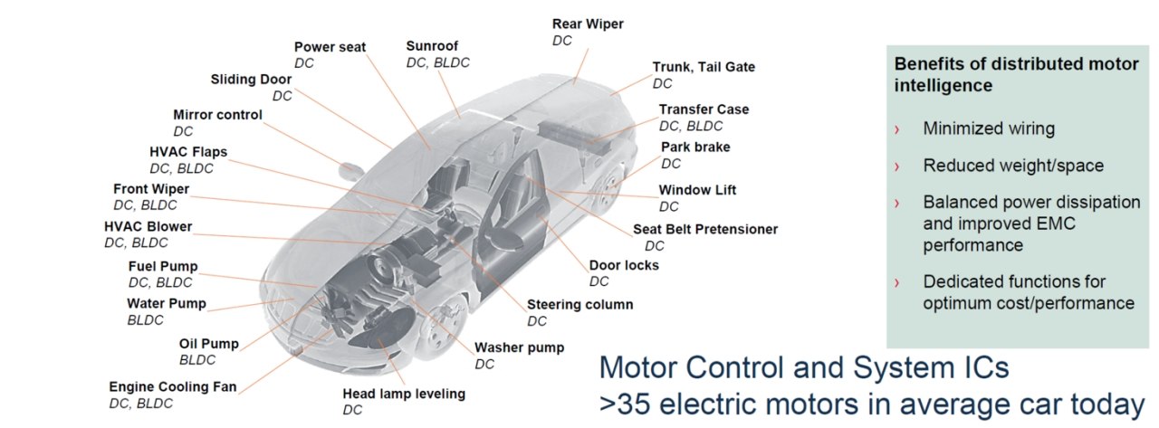 隨著汽車(chē)電氣化和智能化的逐步深入,一輛車(chē)上的電機(jī)數(shù)量越來(lái)越多,應(yīng)用也愈發(fā)豐富。除了負(fù)責(zé)汽車(chē)驅(qū)動(dòng)的電機(jī)外,還有非常多的智能應(yīng)用依賴(lài)于電機(jī)的動(dòng)作執(zhí)行。傳統(tǒng)應(yīng)用的包括車(chē)窗升降、座椅調(diào)節(jié)、空調(diào)等,新興應(yīng)用包括車(chē)燈隨動(dòng)、HUD、激光雷達(dá)、主動(dòng)隔柵等。未來(lái),一輛汽車(chē)的舒適性、安全性、娛樂(lè)性、動(dòng)力性能和皆與電機(jī)密不可分;而對(duì)于電機(jī)驅(qū)動(dòng)的把控,也就意味著對(duì)于整車(chē)品質(zhì)和競(jìng)爭(zhēng)力的掌握。